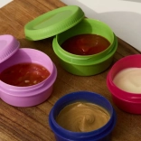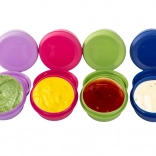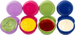 Pojemniki wykonano z bezpiecznego plastiku bez BPA, przeznaczonego do kontaktu z żywnością. Są łatwe w utrzymaniu – można je myć ręcznie lub w zmywarce. Różne kolory pokrywek pomogą szybko rozróżnić zawartość bez otwierania – idealne na ketchup, majonez, musztardę, hummus, przyprawy czy orzechy.