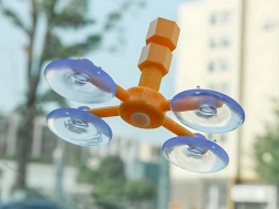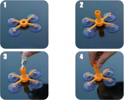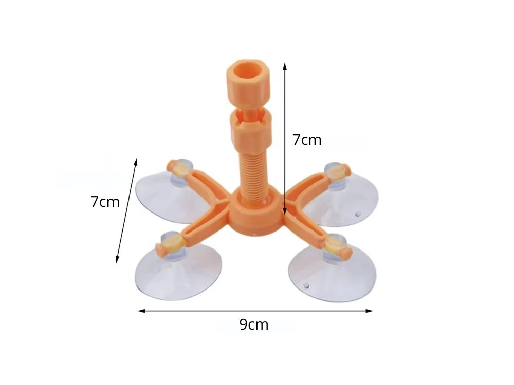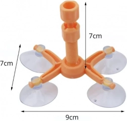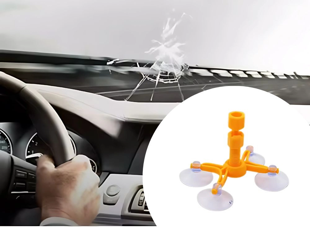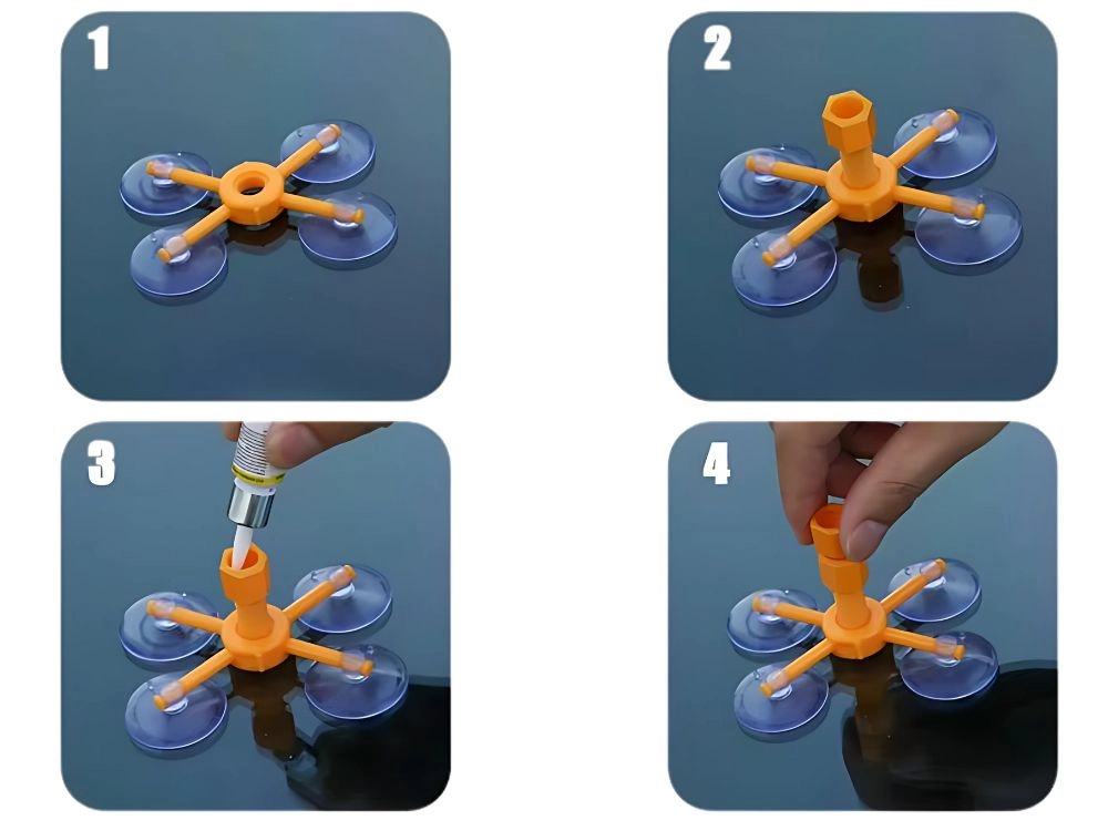 Pomarańczowa podstawka z czterema przyssawkami pewnie trzyma się szyby i precyzyjnie centruje wtryskiwacz nad uszkodzeniem, aby żywica wypełniła miejsce pęknięcia bez przesunięć.
