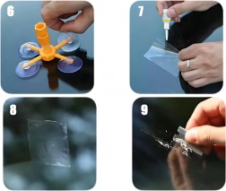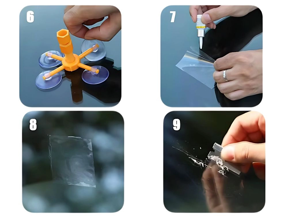 Procedura jest prosta: oczyścić szybę, przyssać aplikator, wstrzyknąć żywicę, usunąć powietrze, przykryć folią i utwardzić na słońcu lub lampą UV. Zestaw idealny do samodzielnego użytku i poradzi sobie z nim każdy dokładny kierowca.