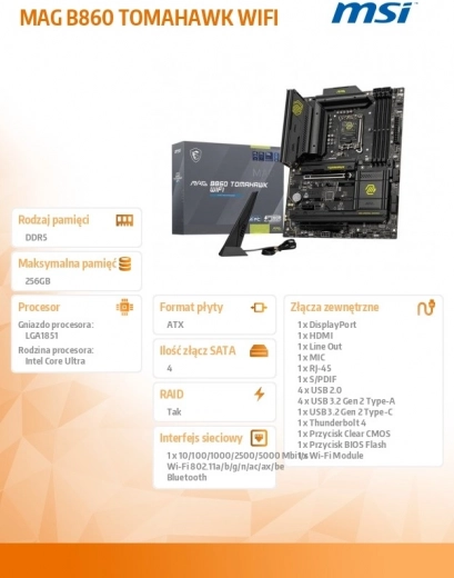 Buduj bez kompromisów. MSI MAG B860 TOMAHAWK WIFI łączy solidne 12+1+1+1‑fazowe zasilanie z 60A SPS, dwoma złączami 8‑pin EPS, technologiami Core Boost i Memory Boost oraz 6‑warstwowym PCB z miedzią 2oz dla stabilności przy wysokim obciążeniu i overclockingu. Ulepszony system chłodzenia Frozr Guard z wydłużonymi radiatorami i podkładkami termicznymi utrzymuje VRM i nośniki danych w idealnych temperaturach podczas długich maratonów gamingowych.