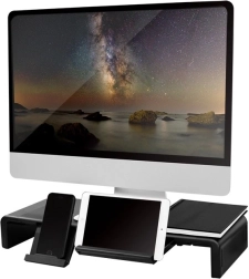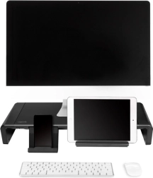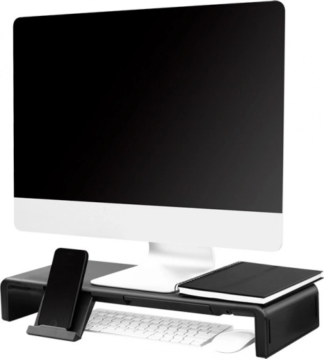 Stwórz wygodne i uporządkowane stanowisko pracy dzięki podstawce pod monitor o udźwigu do 25 kg. Dzięki składanej konstrukcji łatwo dopasujesz szerokość do 420 / 470 / 520 mm. Praktyczna szuflada oraz zintegrowany uchwyt na smartfon i tablet utrzymają biurko w idealnym porządku, a klawiaturę i mysz schowasz pod solidną podstawką z tworzywa i metalu.