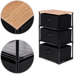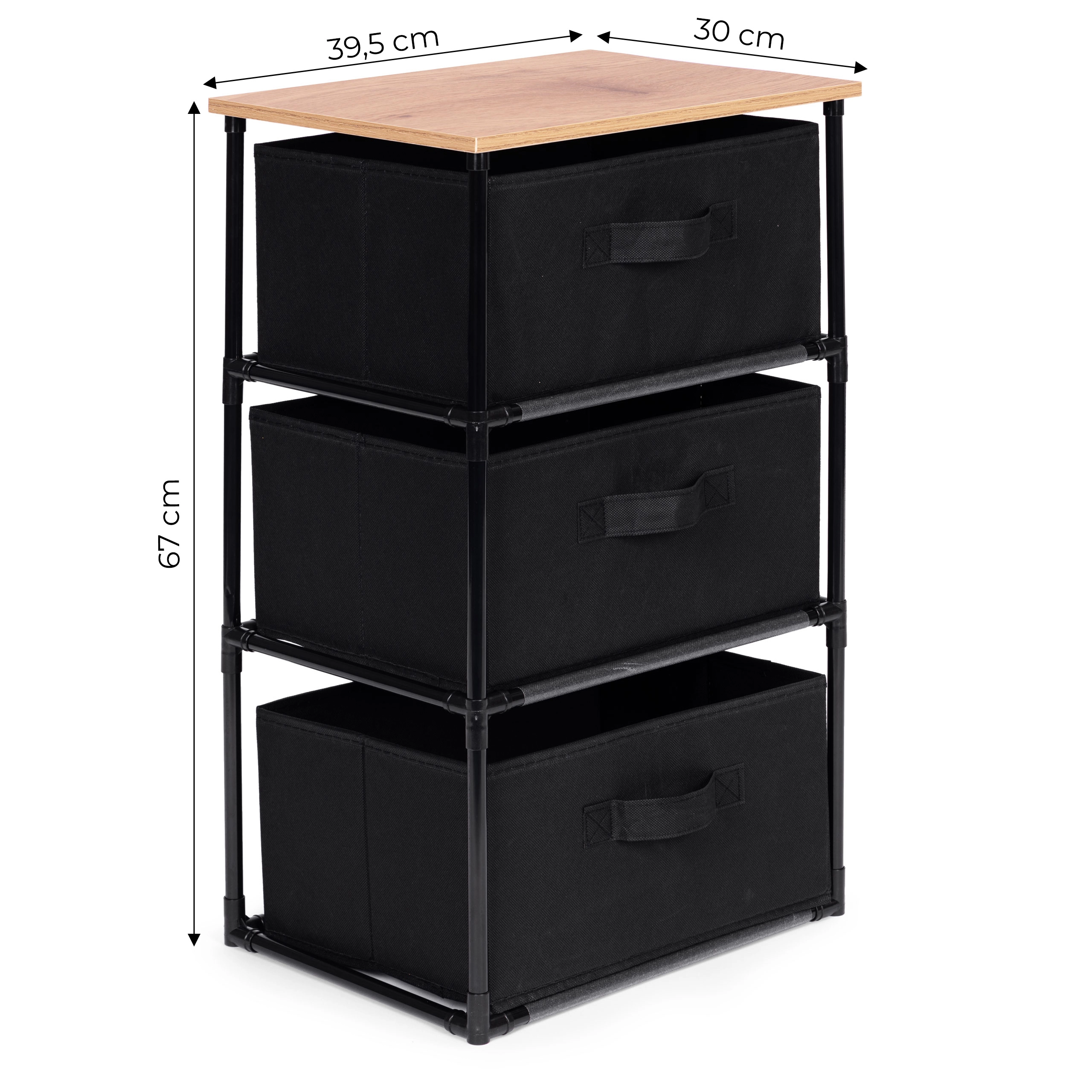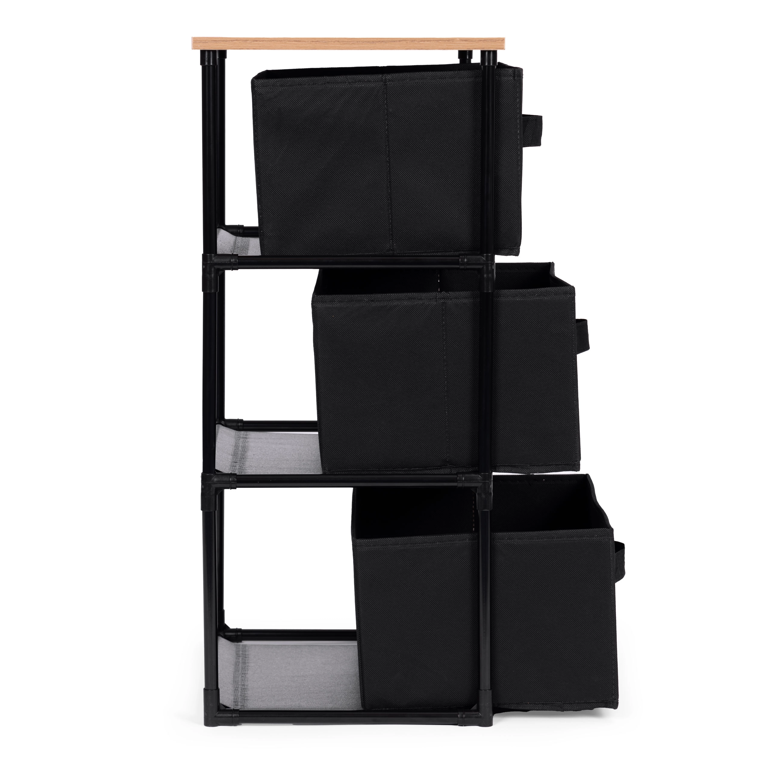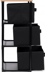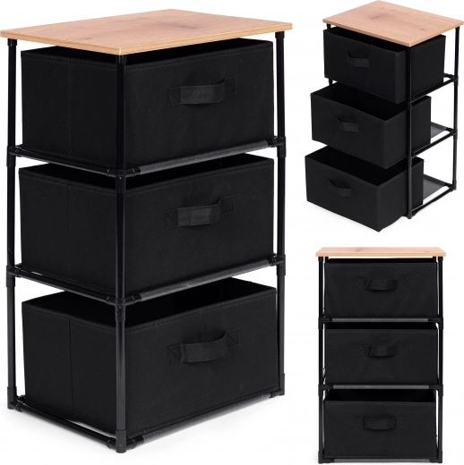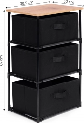 Regał zawiera trzy wyjmowane kosze z wytrzymałej tkaniny, odpowiednie do przechowywania ubrań, książek, zabawek i innych przedmiotów, z łatwym dostępem dzięki praktycznym uchwytom.