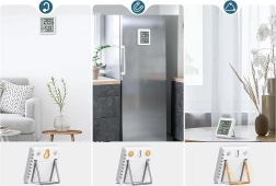Praktyczna konstrukcja pozwala ustawić urządzenie na stole dzięki zintegrowanej podstawce lub przymocować do metalu za pomocą magnesu. Zasilanie zapewnia standardowa bateria CR2032 (w zestawie), więc sprzęt jest gotowy do użycia od razu po wyjęciu z pudełka.