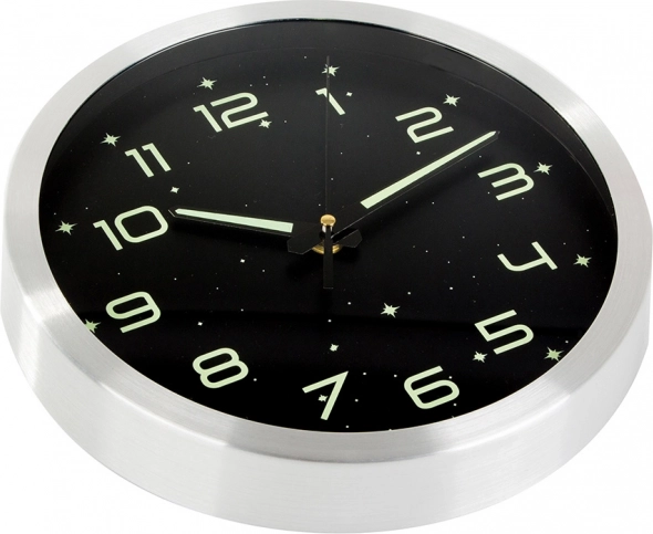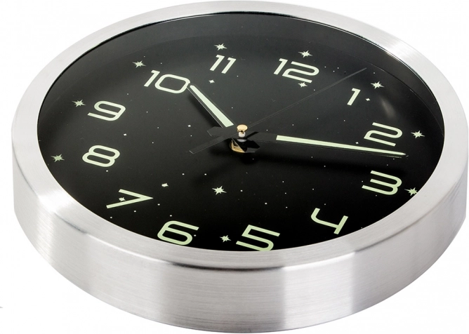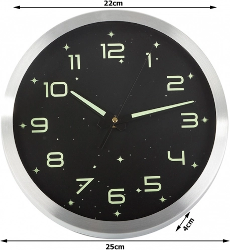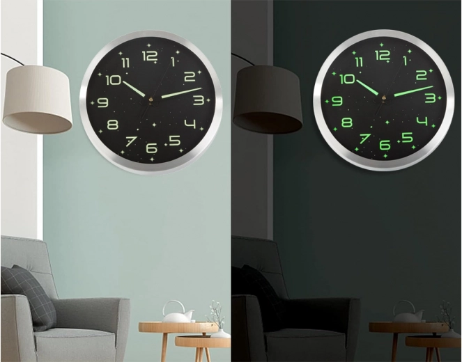 Stylowy zegar ścienny w nowoczesnym wzornictwie łączy funkcjonalność i estetykę. Czarna tarcza ze świecącymi elementami zapewnia doskonałą czytelność w ciemności po wcześniejszym naświetleniu, a metalicznie srebrna rama dodaje wnętrzu eleganckiego akcentu. Cichy mechanizm bez tykania nie zakłóca snu ani pracy.