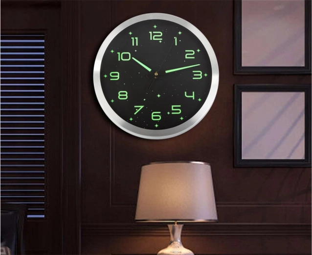 Elegancki zegar ścienny z czarną tarczą i srebrną ramką oferuje świecące cyfry, wskazówki i gwiazdki, ułatwiające odczyt czasu w ciemności. Dzięki cichej, płynnej pracy sprawdzi się w sypialni, pokoju dziecięcym i biurze. Prosty montaż na ścianie oraz oszczędne zasilanie baterią AA czynią go praktycznym i stylowym dodatkiem do każdego wnętrza.