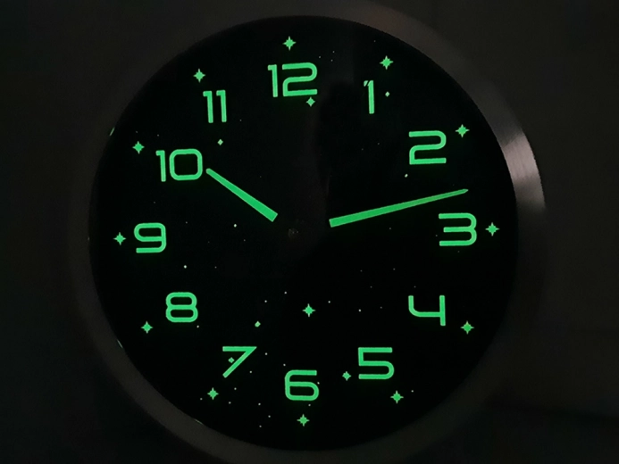 Luminescencyjne cyfry, wskazówki i gwiazdki po naświetleniu rozbłyskują, umożliwiając wygodne sprawdzanie czasu w ciemności.