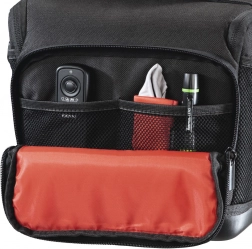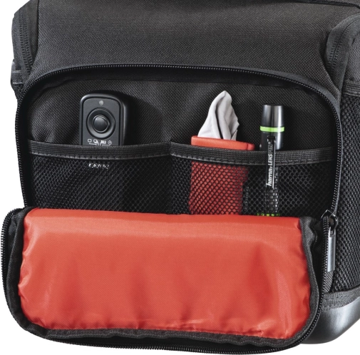 Przednia kieszeń na zamek, boczne siatki i regulowana wewnętrzna przegroda utrzymują porządek – od kabli, przez karty, po baterie.