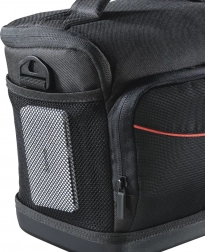 Wnętrze można dostosować za pomocą regulowanej przegrody, więc łatwo zorganizujesz kamerę, baterie, ładowarkę i karty pamięci. Praktyczna przednia kieszeń na zamek oraz boczne siatki zapewniają szybki dostęp do drobnych akcesoriów. Wytrzymałe dno z EVA utrzymuje torbę stabilnie i chroni zawartość nawet na wilgotnym lub nierównym podłożu.