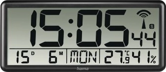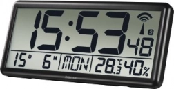 Radiobudzik z bardzo dużym cyfrowym wyświetlaczem czasu, temperatury, wilgotności i kalendarza, idealny do użytku w domu lub biurze.
