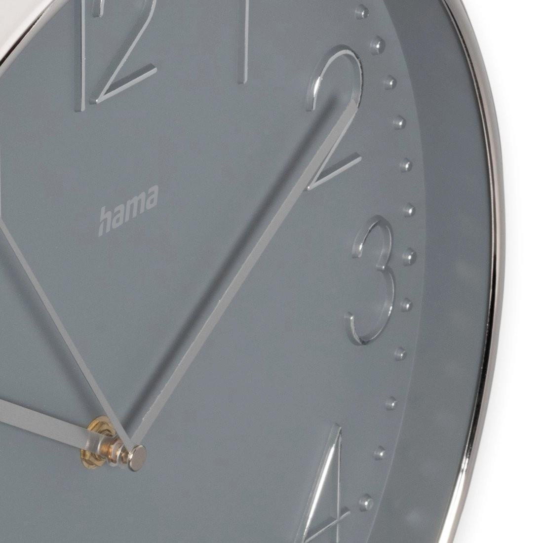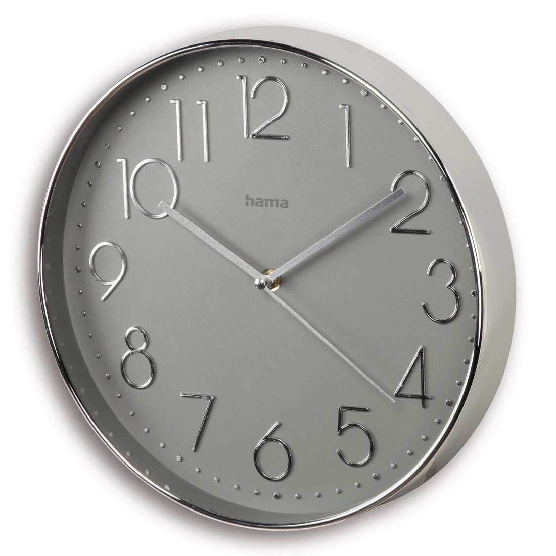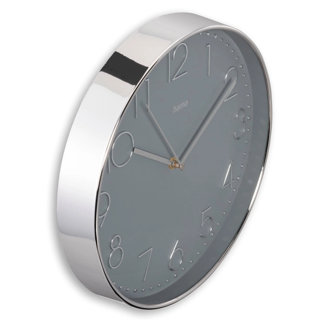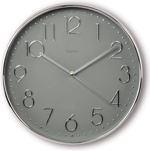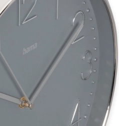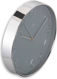 Szara tarcza o średnicy 30 cm z srebrnym ramieniem nadaje ponadczasowy wygląd. Duży analogowy wyświetlacz z wyraźnymi wskazówkami ułatwia odczyt czasu z każdej odległości.