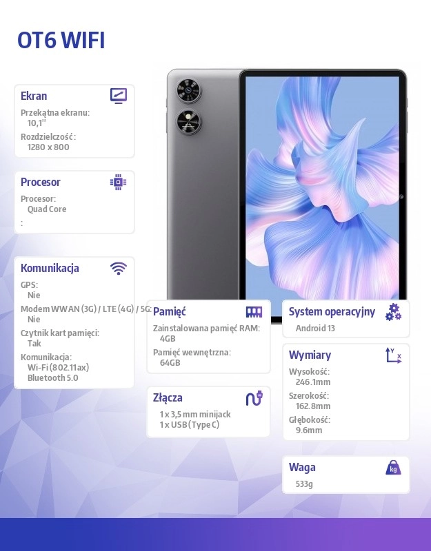 Tablet Oukitel OT6 został zaprojektowany tak, aby sprostać Twoim codziennym potrzebom. Z 10,1-calowym ekranem IPS o rozdzielczości 1280 x 800 pikseli cieszysz się jasnym i ostrym obrazem podczas oglądania wideo lub korzystania z aplikacji. Czterordzeniowy procesor Rockchip RK3562 z taktowaniem 2,0 GHz i 4 GB RAM zapewnia płynne działanie systemu Android 13, co gwarantuje efektywną wielozadaniowość.