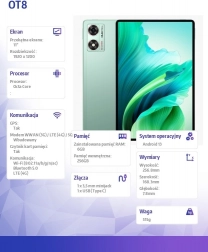 Wyposażony w ośmiordzeniowy procesor Unisoc T606 oraz 6 GB RAM z możliwością rozszerzenia do 30 GB, urządzenie poradzi sobie także z wymagającymi zadaniami. Wewnętrzna pamięć 256 GB, rozszerzalna do 1 TB, oferuje dużo miejsca na wszystkie pliki. Wysokiej pojemności bateria 8800 mAh zapewnia energię nawet na dwa dni typowego użytkowania.