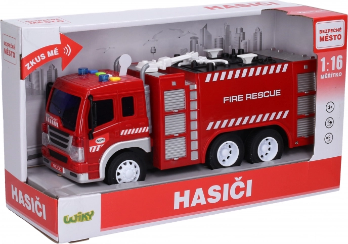 Samochód strażacki z sikawką i efektami, dÅugoÅÄ 28 cm, efekty Åwietlne i dźwiÄkowe, odpowiedni dla dzieci od 3 lat.