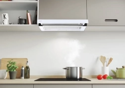 Teleskopowy okap o stylowym, białym wzornictwie doskonale pasuje do każdej nowoczesnej kuchni.
