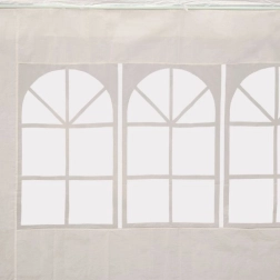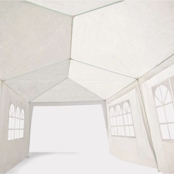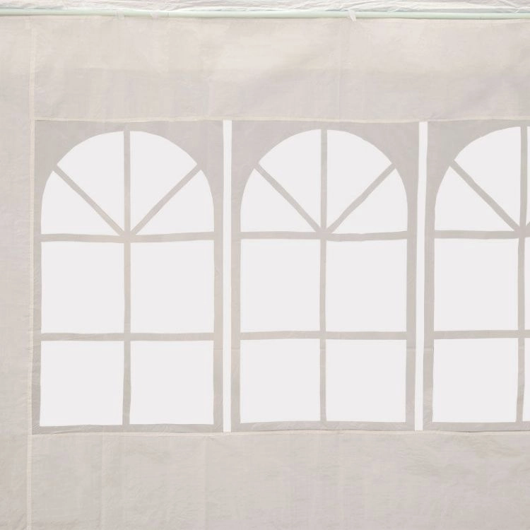 Konstrukcja z gęstych, proszkowo malowanych metalowych rur o średnicy 32/25/25 mm zapewnia stabilność i odporność na korozję. Każda noga namiotu jest zabezpieczona kołkami dla większej stabilności. Dach i ściany wykonane są z wytrzymałej tkaniny PE (100 g/m2) w eleganckim białym kolorze.