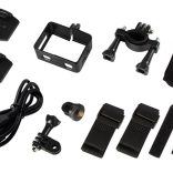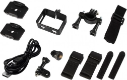 - Wodoszczelna obudowa, uchwyty (kask/kierownica), uchwyt ramowy, mocowania samoprzylepne, paski, kabel USB, pilot zdalnego sterowania