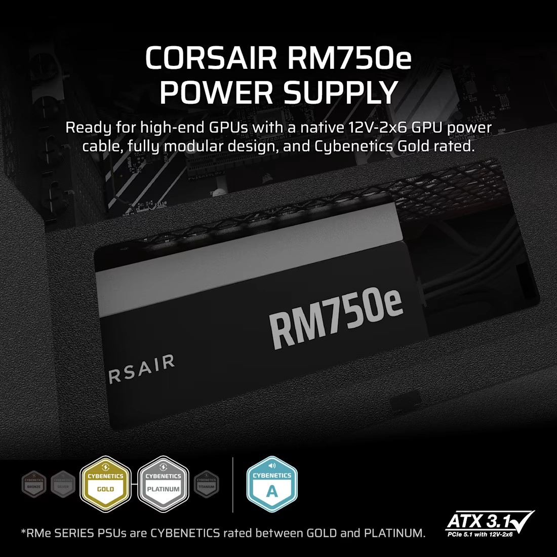 W pełni modularny zasilacz Corsair RM750e zapewnia cichą pracę, najwyższą wydajność 80 Plus Gold oraz wsparcie ATX 3.1 i PCIe 5.1. Dzięki specjalnemu złączu 12V-2x6 (do 600 W) dla nowoczesnych kart graficznych oraz kompaktowym wymiarom z łatwością opanujesz okablowanie i zbudujesz czysty, efektywny zestaw.