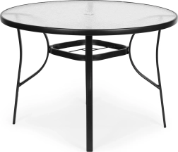 Elegancki okrągły stół MultiGarden o średnicy 80 cm idealnie sprawdzi się na tarasie, balkonie i w ogrodzie. Łączy hartowane szkło z wytrzymałą stalową ramą, oferuje stabilną konstrukcję z dwiema wzmocnieniami oraz otwór na parasol (4,5 cm). Jest odporny na warunki pogodowe, łatwy w czyszczeniu i wygodnie pomieści do 4 osób.