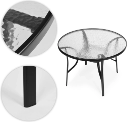 Ciesz się wypoczynkiem na świeżym powietrzu z okrągłym stołem MultiGarden, który dzięki minimalistycznemu wzornictwu oraz połączeniu czarnej stali i szklanego blatu doskonale wpasuje się w każdą przestrzeń zewnętrzną. Hartowane szkło „Water Wave” z ochroną krawędzi w czarnej ramce jest odporne na obciążenia mechaniczne i pogodę, a jednocześnie bardzo łatwe w utrzymaniu.