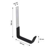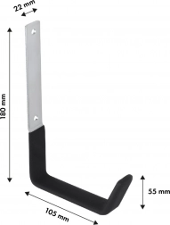 Montaż jest szybki i prosty – płyta z dwoma otworami montażowymi trzyma się pewnie ściany, a hak wytrzymuje codzienne obciążenia. Praktyczne wymiary 180 × 105 × 55 mm oraz ergonomicznie ukształtowana, gumowana część haka zwiększają bezpieczeństwo i komfort użytkowania.