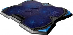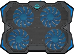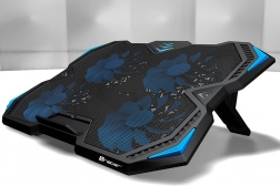 Wydajne i ciche wentylatory: Podkładka jest wyposażona w cztery ciche wentylatory 140 mm, które mogą osiągać prędkość do 1000 obrotów na minutę, zapewniając efektywne chłodzenie urządzenia. Niebieskie podświetlenie LED nadaje podkładce futurystyczny wygląd.