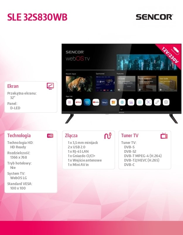 Praktyczne podwójne zasilanie 230 V / 12 V (zasilacz w zestawie) poszerza możliwości użytkowania – idealnie do kampera, na łódź lub na działkę. Bogata łączność z 3× HDMI (1× ARC, CEC), 2× USB, LAN, CI+ i wyjściem 3,5 mm pozwala podłączyć konsolę, dysk i soundbar. Dźwięk z obsługą Dolby Digital Plus i mocą 18 W zapewnia solidną głośność i wyraźne dialogi.
