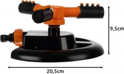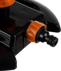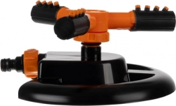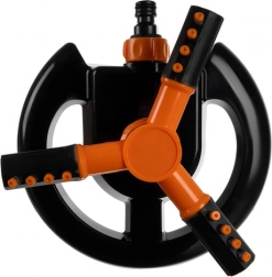 Trzy obrotowe ramiona z 12 dyszami rozpraszają wodę we wszystkich kierunkach. Płynna rotacja o 360° zapewnia równomierne nawadnianie nawet złożonych powierzchni bez konieczności zmiany położenia zraszacza.