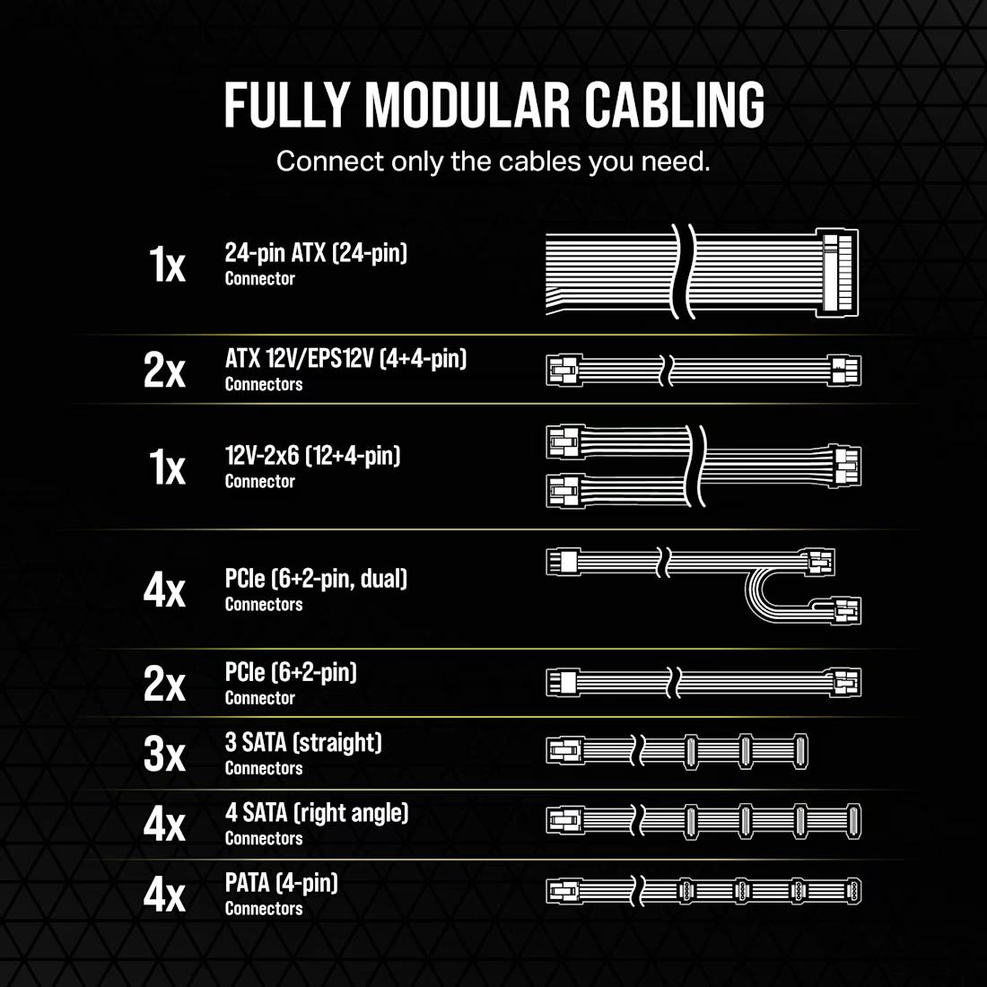 Podłączaj tylko to, czego potrzebujesz – pięć uniwersalnych złączy 8‑pin pokryje zasilanie nowoczesnych płyt głównych oraz wydajnych GPU i ułatwi zarządzanie przewodami.