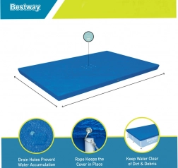 Pokrywa Bestway jest zaprojektowana tak, aby skutecznie chronić twój basen przed owadami, liśćmi, ptakami i lekkim deszczem. Dzięki solidnym linom mocującym jest odporna na wiatr, a otwory spustowe zapobiegają gromadzeniu się wody. Pokrywa zapewnia dodatkową izolację cieplną dla wody w basenie.