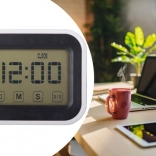 Uniwersalny cyfrowy zegar z budzikiem w nowoczesnym wzornictwie uporządkuje Twój dzień w domu i w pracy. Czytelny wyświetlacz LCD pokazuje czas w formacie 12/24 h, a dzięki podświetleniu łatwo sprawdzisz godzinę nocą bez zapalania światła. Obsługa jest intuicyjna i odpowiednia dla dzieci oraz seniorów.