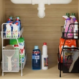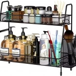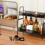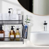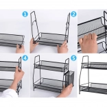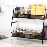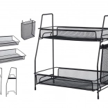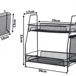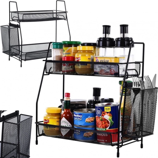 Stylowy organizer z trwałej metalowej siatki pomaga maksymalnie wykorzystać przestrzeń pionową na blacie, w spiżarni oraz na toaletce. Dwa poziomy mieszczą przyprawy, słoiki, butelki z olejem, sosy, a także kosmetyki i perfumy. Boczny koszyk jest idealny na sztućce, akcesoria kuchenne czy szczotki i pędzle.