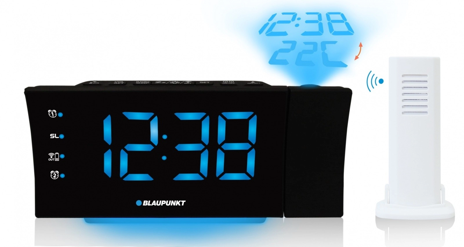 Duży, jasny i ściemniany wyświetlacz LED jest czytelny nawet z daleka. Za wyjątkowy komfort odpowiada projektor, który wyświetla aktualny czas i temperaturę zewnętrzną na suficie lub ścianie. Informacje o temperaturze dostarcza bezprzewodowy czujnik zewnętrzny – wystarczy umieścić go za oknem.