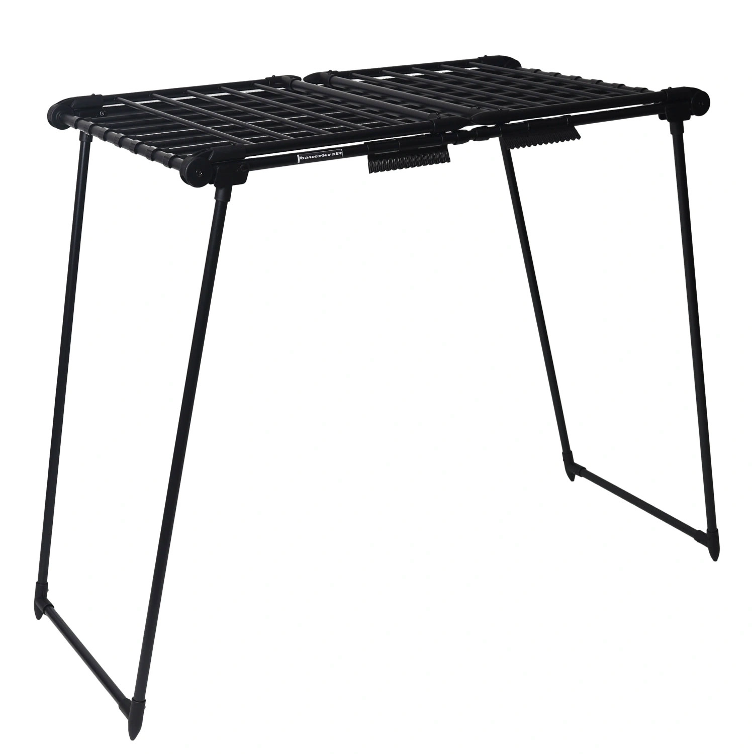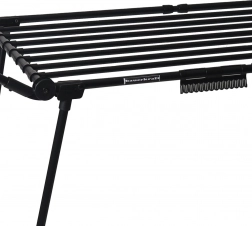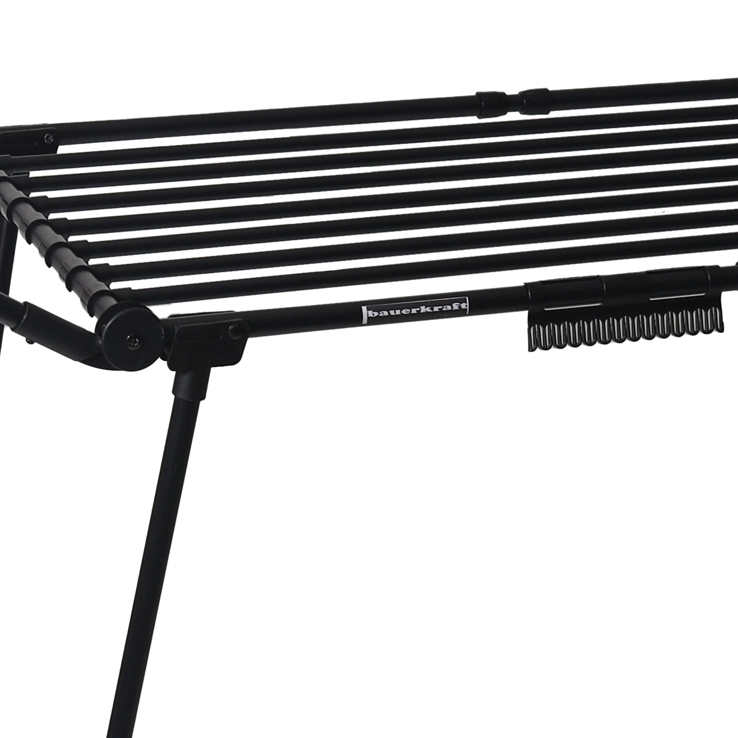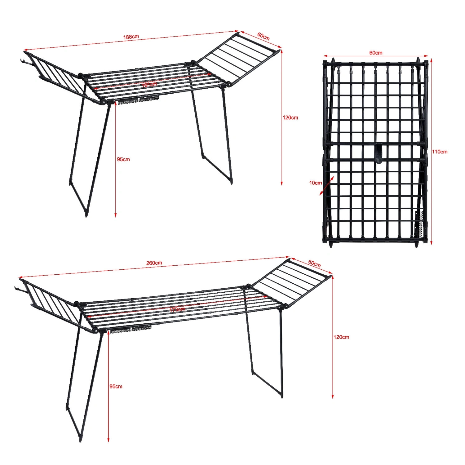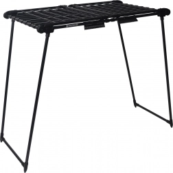 Oszczędzająca miejsce konstrukcja szybko się składa do kompaktowych wymiarów 60 × 10 × 110 cm. Matowe czarne wykończenie jest odporne na korozję i zużycie mechaniczne, dzięki czemu nadaje się zarówno do wnętrz, jak i na balkon czy taras.