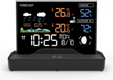 Nowoczesna bezprzewodowa stacja pogodowa z kolorowym wyświetlaczem LCD zapewnia dokładny pomiar temperatury i wilgotności w pomieszczeniu i na zewnątrz, barometr do monitorowania ciśnienia, radiowo sterowany zegar z budzikiem oraz prognozę pogody na 12–24 h. Dzięki bezprzewodowemu czujnikowi do 30 m i regulowanemu podświetleniu łatwo odczytasz dane w dzień i w nocy.