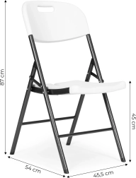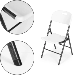 Metalowa konstrukcja z powłoką proszkową oraz antypoślizgowe nóżki zapewniają trwałość i bezpieczeństwo. Mechanizm składania umożliwia szybkie złożenie i rozłożenie krzesła.