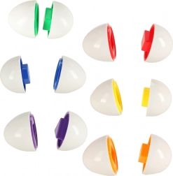 Kolorowe jajka pomagają dzieciom rozwijać koordynację oka i ręki poprzez łączenie połówek na podstawie kształtów i kolorów.