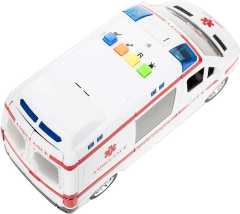 Po naciśnięciu kolorowych przycisków karetka uruchamia efekty świetlne oraz dźwięki silnika, syreny i klaksonu, które zamieniają każdą jazdę w akcję ratunkową.