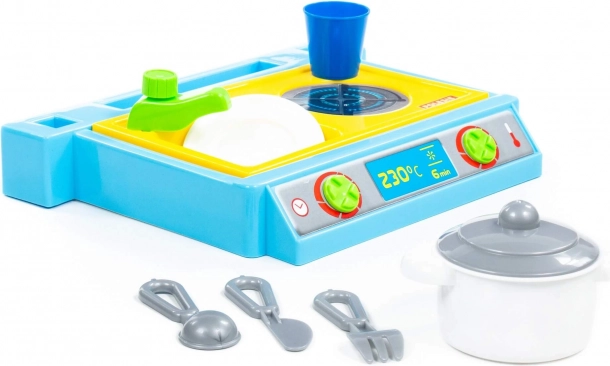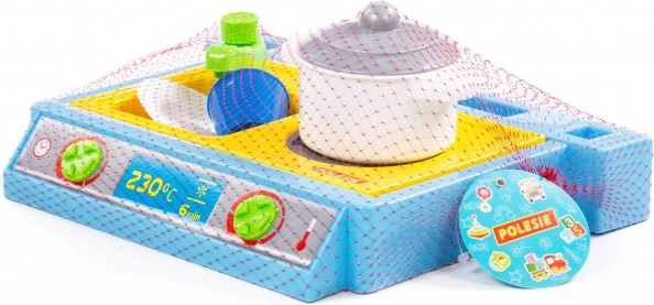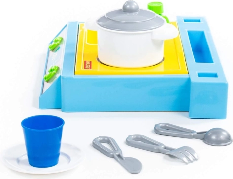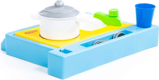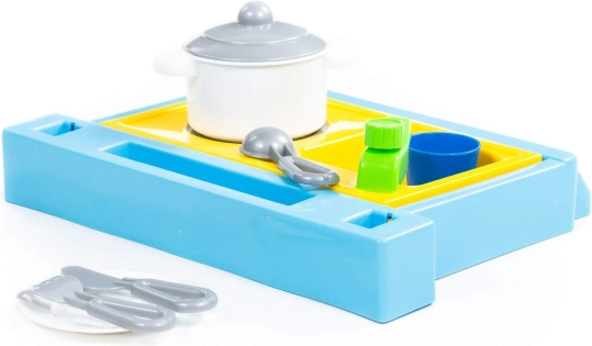 Mały zestaw stołowy zawierający zlew, palnik i zestaw naczyń