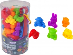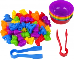 Ten kolorowy zestaw montessori oferuje prostą, a zarazem bardzo skuteczną formę nauki. Dzieci wysypują figurki na stół i za pomocą pęsety przyporządkowują je do miseczek według koloru, rozwijając koordynację oko–ręka, koncentrację i logiczne myślenie. Gumowe figurki są przyjemne w dotyku i bezpieczne dla małych rączek.