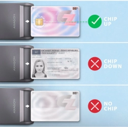- Uwaga: działa wyłącznie ze stykowymi kartami z widocznymi stykami, nie z bezstykowymi RFID.