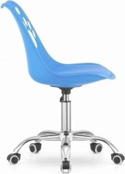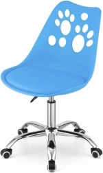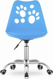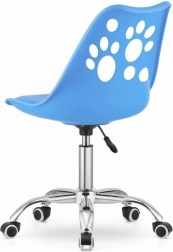Niebieskie plastikowe krzesło obrotowe z metalową podstawą i dekoracyjnymi wycięciami w kształcie łapek, idealne do domowego biura lub pokoju dziecięcego.