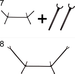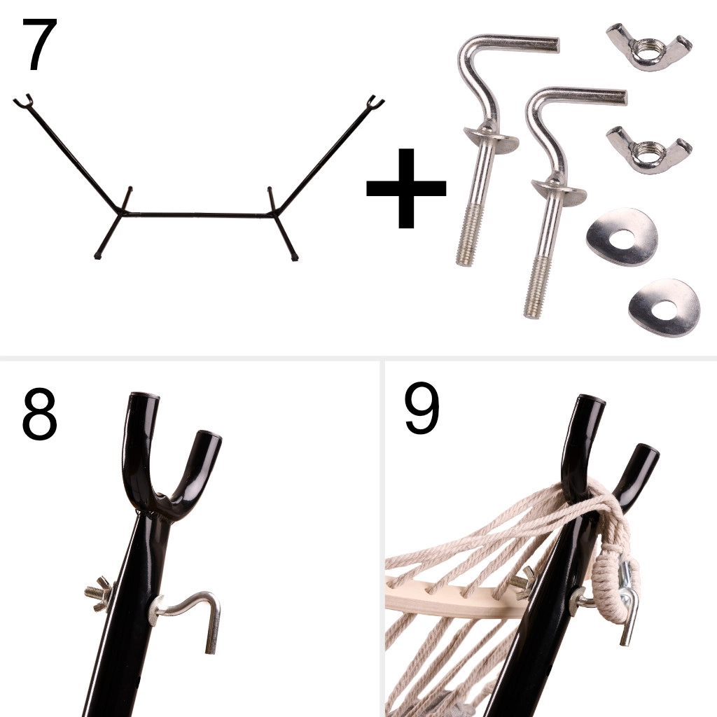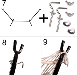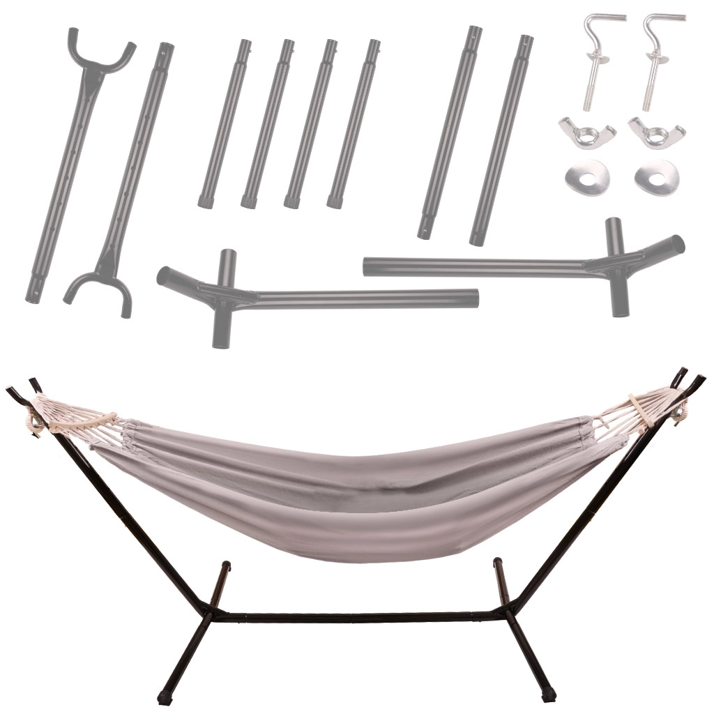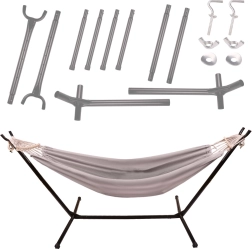 - hamak, metalowy stojak (10 części), narzędzia montażowe, instrukcja, worek transportowy 72 × 18 × 23 cm