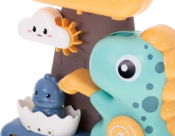 Głównymi postaciami zabawki są kolorowe dinozaury i uśmiechnięta chmurka, które każdą kąpiel zamieniają w czystą radość. Zabawka stymuluje kreatywność i wyobraźnię dzieci oraz rozwija logiczne myślenie. Dziecko może obserwować, jak woda wlana na jedno miejsce przepływa przez inny otwór, wprawiając w ruch wszystkie części zabawki.<p>