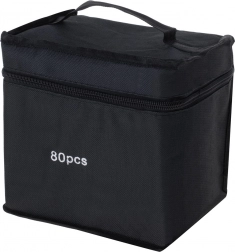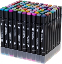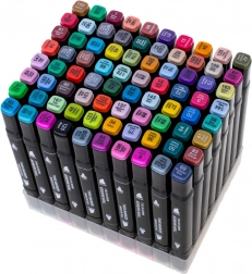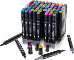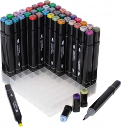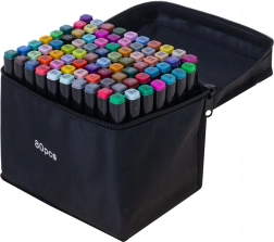 Praktyczna plastikowa podstawka utrzymuje flamastry w przejrzystym układzie, a materiałowe etui na zamek chroni je i ułatwia przenoszenie.