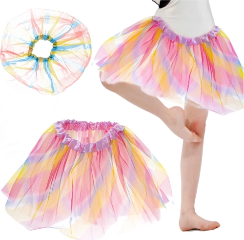 Ta kolorowa spódniczka tutu to świetny dodatek do występów szkolnych i przedszkolnych, lekcji tańca oraz kostiumowych zabaw. Trzy warstwy sztywniejszego, marszczonego tiulu pięknie trzymają kształt i tworzą efektowną objętość.