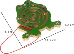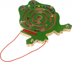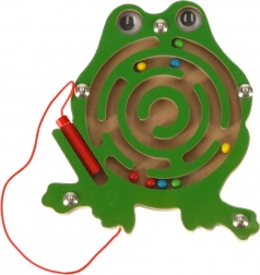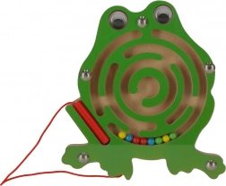 Ten drewniany magnetyczny labirynt w kształcie żabki zajmie dzieci na długie chwile w domu i w podróży. Dołączony magnetyczny długopis na sznurku pomaga prowadzić kolorowe kuleczki zawiłymi torami aż do celu. Przezroczysta osłona gwarantuje, że kuleczki zawsze pozostaną wewnątrz zabawki.