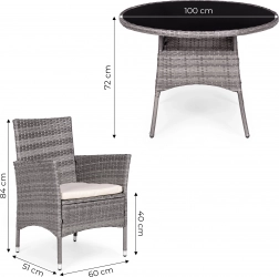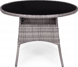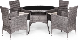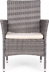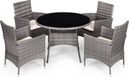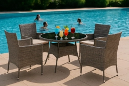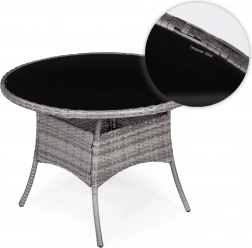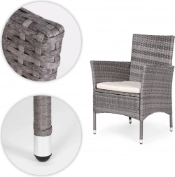 Zestaw wykonany jest z wytrzymałego polirattanu, który jest odporny na promienie słoneczne, wilgoć i zmiany temperatury. Jego powierzchnia jest również łatwa do czyszczenia – wystarczy przetrzeć wilgotną szmatką.