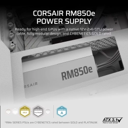 Biały zasilacz Corsair RM850e to w pełni modularny zasilacz ATX o niskim poziomie hałasu z certyfikacją ATX 3.1. Oferuje wysoką wydajność i niezawodność dzięki standardowi Cybenetics Gold oraz ulepszone zarządzanie okablowaniem.