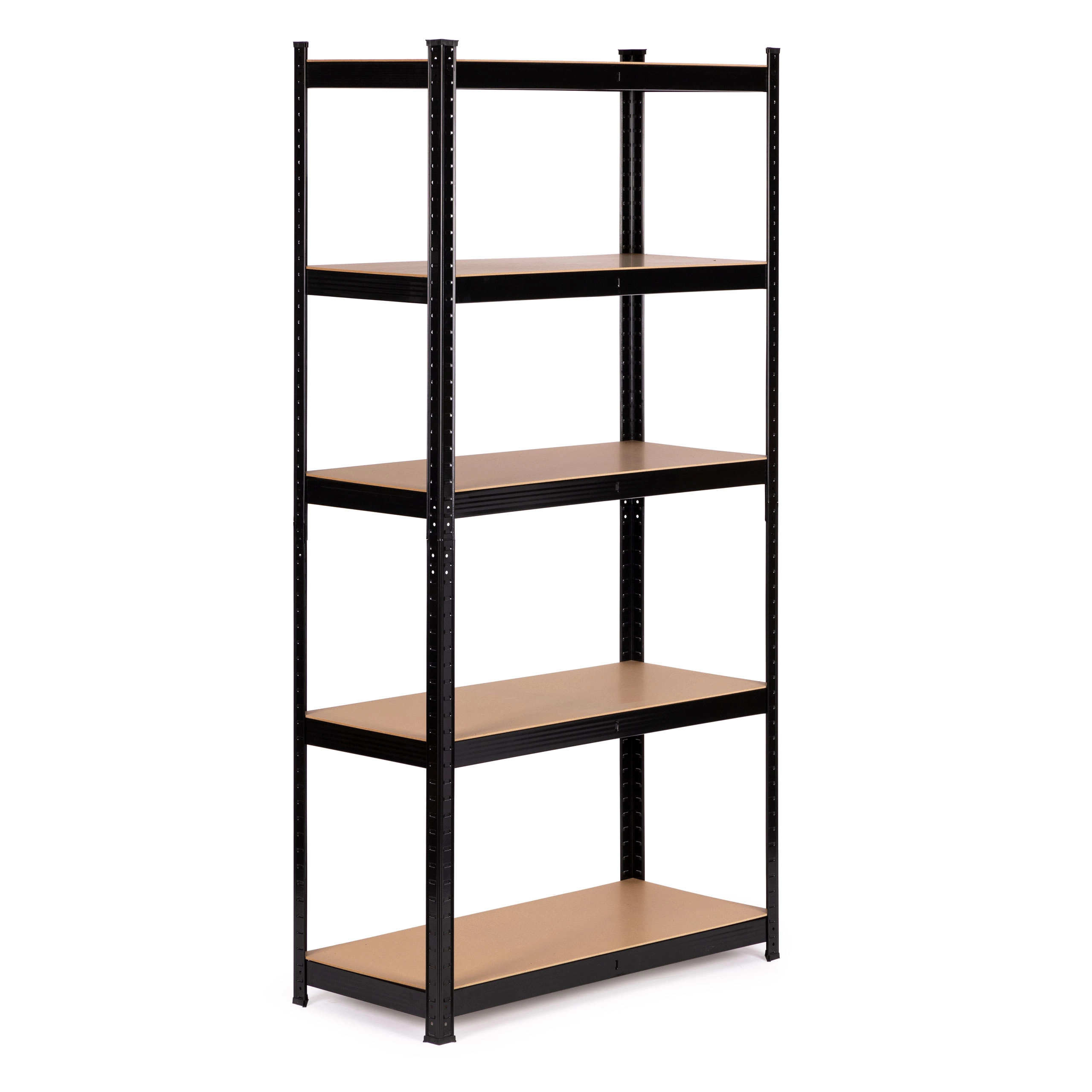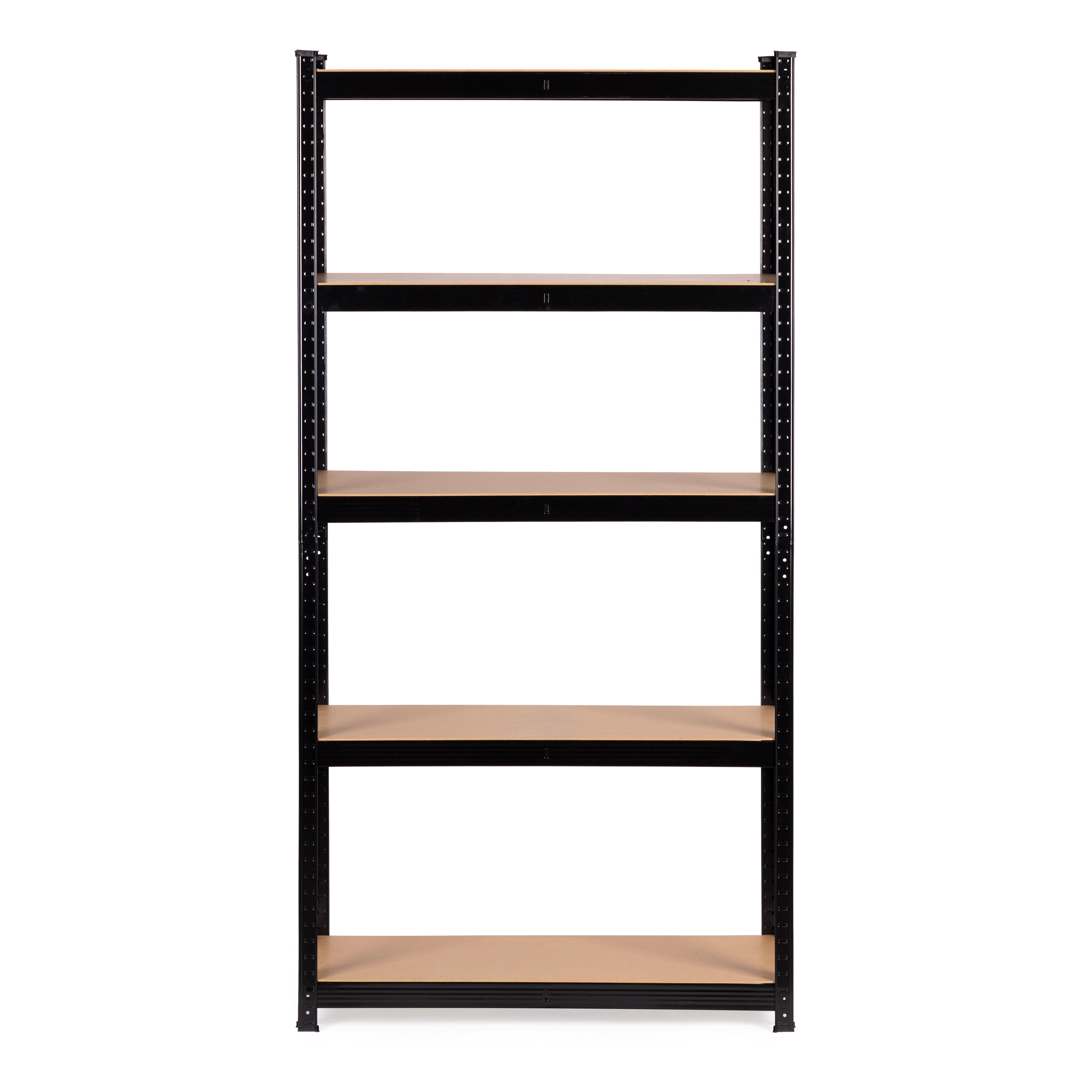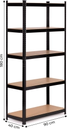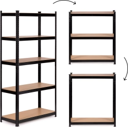 Regał posiada 5 solidnych półek, które możesz zamocować na dowolnej wysokości według potrzeb. Każda półka ma dodatkowe centralne wzmocnienie dla zapewnienia stabilności. Półki wykonano z wytrzymałej płyty MDF, odpornej na uszkodzenia mechaniczne i nacisk, co gwarantuje długotrwałe, bezproblemowe użytkowanie.