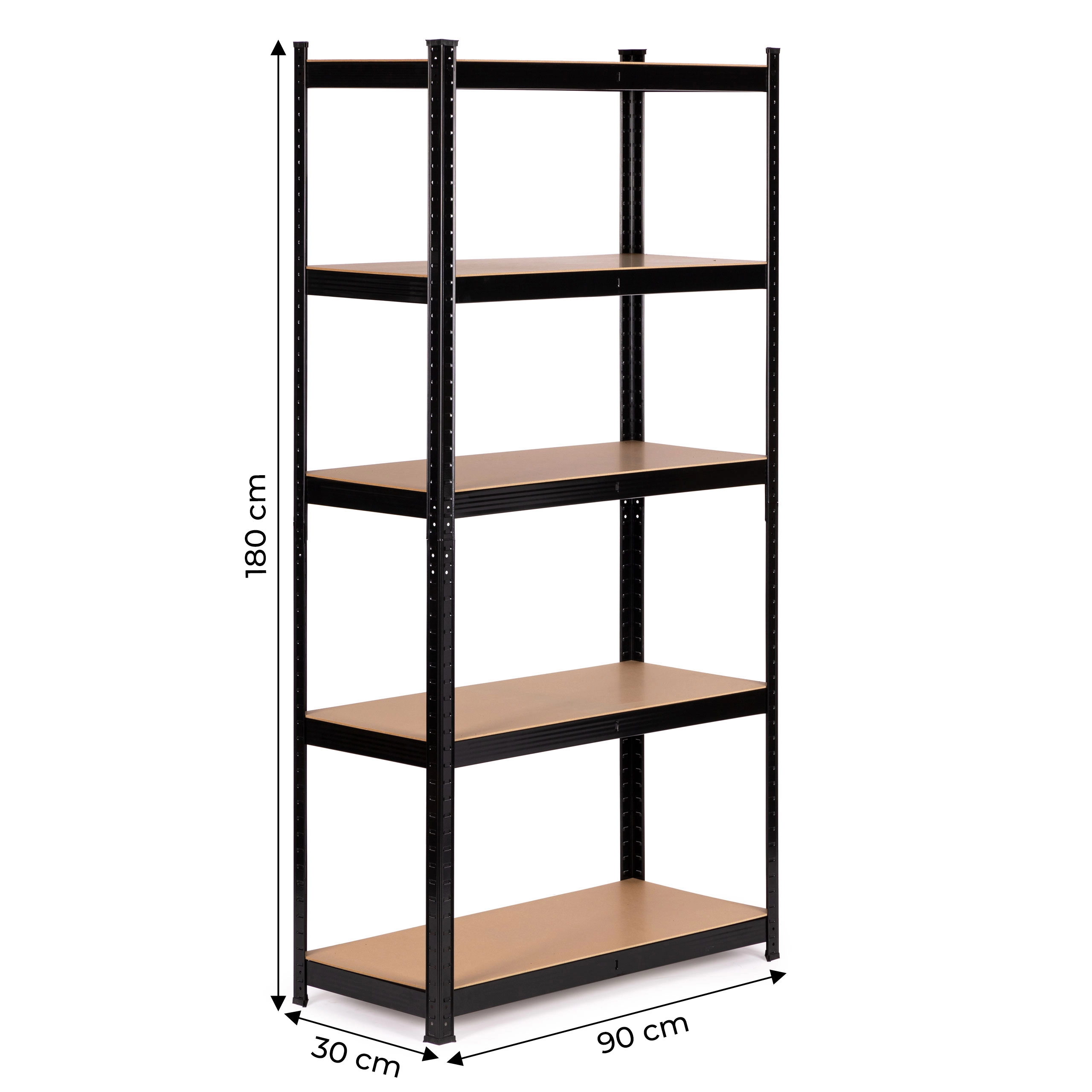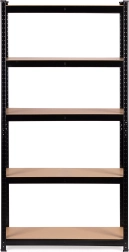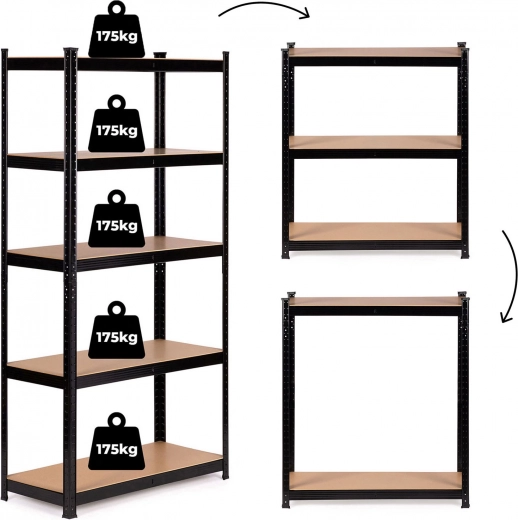 Regał posiada 5 wytrzymałych półek, które można zamontować na dowolnej wysokości, co pozwala dopasować układ do własnych potrzeb. Konstrukcja została wzmocniona dodatkowym środkowym wspornikiem pod każdą półką dla zapewnienia stabilności.
